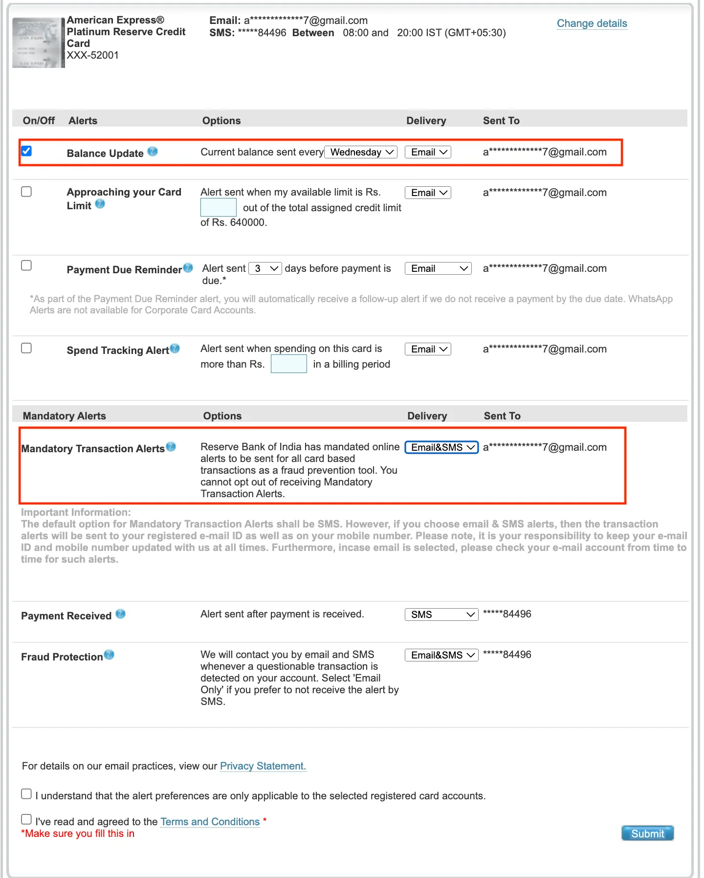 Step 4: Enable Balance Update and ensure Mandatory Transaction Alerts are set for both Email and SMS.